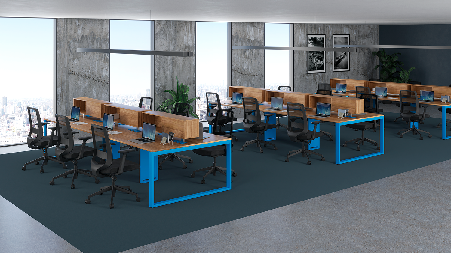 Mesas retas, mesas em L, plataformas, call centers, divisórias para plataformas em vidro, tecido, MDP, prateleira divisória para plataforma, nicho divisor para plataforma, abafadores revestidos em tecido, caixa de tomadas e calhas.